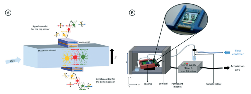 Les cellules que l'on veut détecter sont marquées avec des microbilles magnétiques puis injectées dans un canal microfluidique placé au voisinage d'un capteur GMR. Après aimantation des microbilles, leur champ dipolaire est détecté lors de leur passage au niveau du capteur. Le marquage est rendu possible par la fonctionnalisation des microbilles avec des anticorps monoclonaux spécifiques d'une protéine de surface de la cellule à détecter.