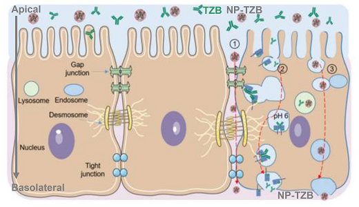Après avoir caractérisé les NP-TZB en termes de taille (sphériques, d'un diamètre d'environ 200 nm) et d'efficacité d'encapsulation du TZB (67 %), les auteurs ont validé leur passage à travers le modèle d'épithélium nasal. Ils ont également comparé le passage des NP-TZB à celui du TZB libre à travers un modèle in vitro de BHE, simulant une administration systémique. Si la formulation NP-TZB entraîne une augmentation significative du transport du TZB sans formulation à travers l'épithélium nasal, aucune amélioration significative du transport des NP-TZB n'est observée à travers le modèle de BHE in vitro. Le TZB transporté par les nanoparticules et libéré dans le compartiment basal est pleinement fonctionnel et reconnaît toujours la protéine HER2 exprimée à la surface de cellules tumorales mammaires (BT474).​
