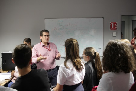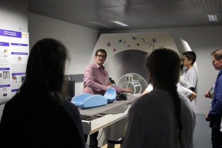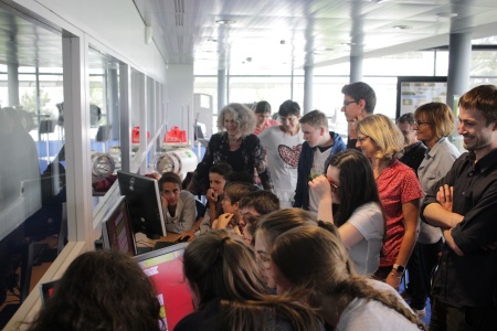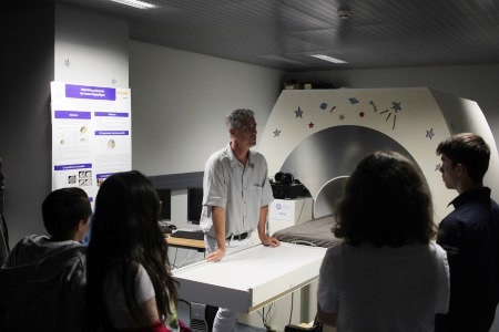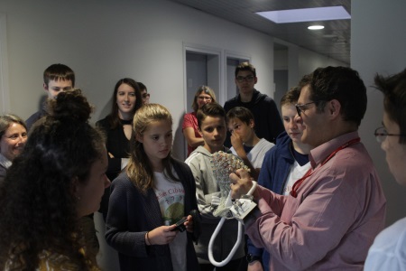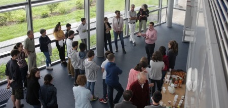 Le 12 juin dernier, 14 collégiens accompagnés de leurs professeurs de SVT, physique-chimie et technologie, d'Elodie Chaillou et de collaborateurs du projet, dont Béatrice Saulnier la médiatrice scientifique du Centre Sciences, ont été accueillis à NeuroSpin par Cyril et son équipe. Un programme sur mesure les attendait. Ainsi, ils ont eu la chance de visiter le plateau technique de NeuroSpin (Cyril Poupon et Lionel Allirol), de réaliser des expériences ludiques conçues et animées par Christine Doublé, Raïssa Yebga-Hot et Justine Beaujoin. Après le déjeuner et la traditionnelle photo de groupe, les élèves ont présenté leur travail, réalisé au cours de l'année scolaire : des robots simulant le comportement des lignées de cailles très émotives et peu émotives.