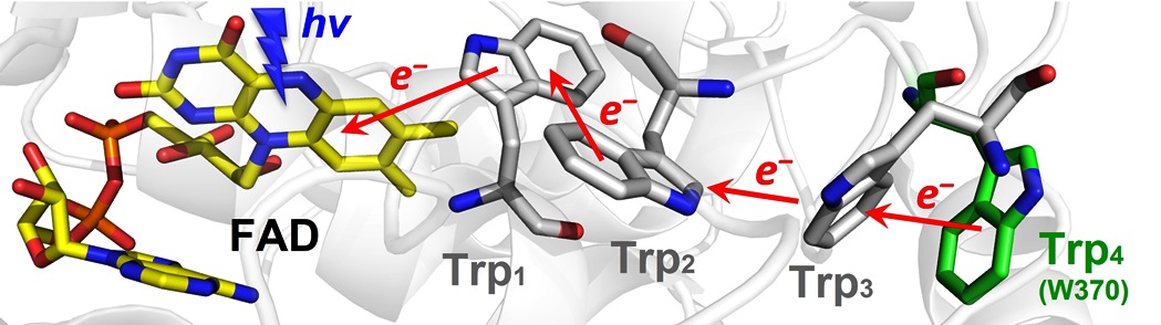 Photolyases et cryptochromes sont des flavoprotéines qui utilisent le FAD comme cofacteur. Un élément fonctionnel commun des photolyases et des cryptochromes est une chaine de transfert d'électrons composée typiquement de trois résidus tryptophane qui permet de réduire le cofacteur FAD excité par un photon. Cette réaction dénommée "photoactivation" est préalable à la photoréparation de l'ADN par les photolyases et, chez les cryptochromes, elle active la signalisation.