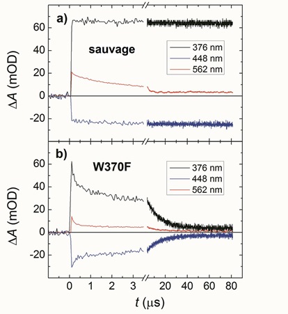Nous avons étudié par spectroscopie d'absorption cinétique le rôle fonctionnel de ce quatrième tryptophane dans la photolyase (6-4) de Xenopus laevis (Xl(6-4)PL) qui a été surexprimée dans le laboratoire du Dr Junpei Yamomoto (Osaka, Japon). En comparant la protéine sauvage avec une protéine mutée (dont le quatrième tryptophane W370 est remplacé par une phénylalanine (F) qui ne peut pas transférer un électron), nous avons pu établir que le quatrième tryptophane sert à stabiliser la photoactivation: le temps de vie de la paire de radicaux FAD°− Trp° dans la protéine sauvage est de 40 ms contre 10 µs dans la protéine mutée W370F (Fig. 2).