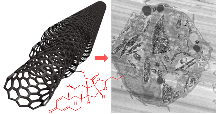 Des nanotubes de carbone ont été fonctionnalisés avec le budésonide et évalués vis-à-vis de leur capacité à être internalisés dans les macrophages et à inhiber la sécrétion de cytokines. Des expériences conduites in vitro ont montré que les nanohybrides pénétraient spontanément dans les cellules phagocytaires tout en préservant un effet anti-inflammatoire puissant.