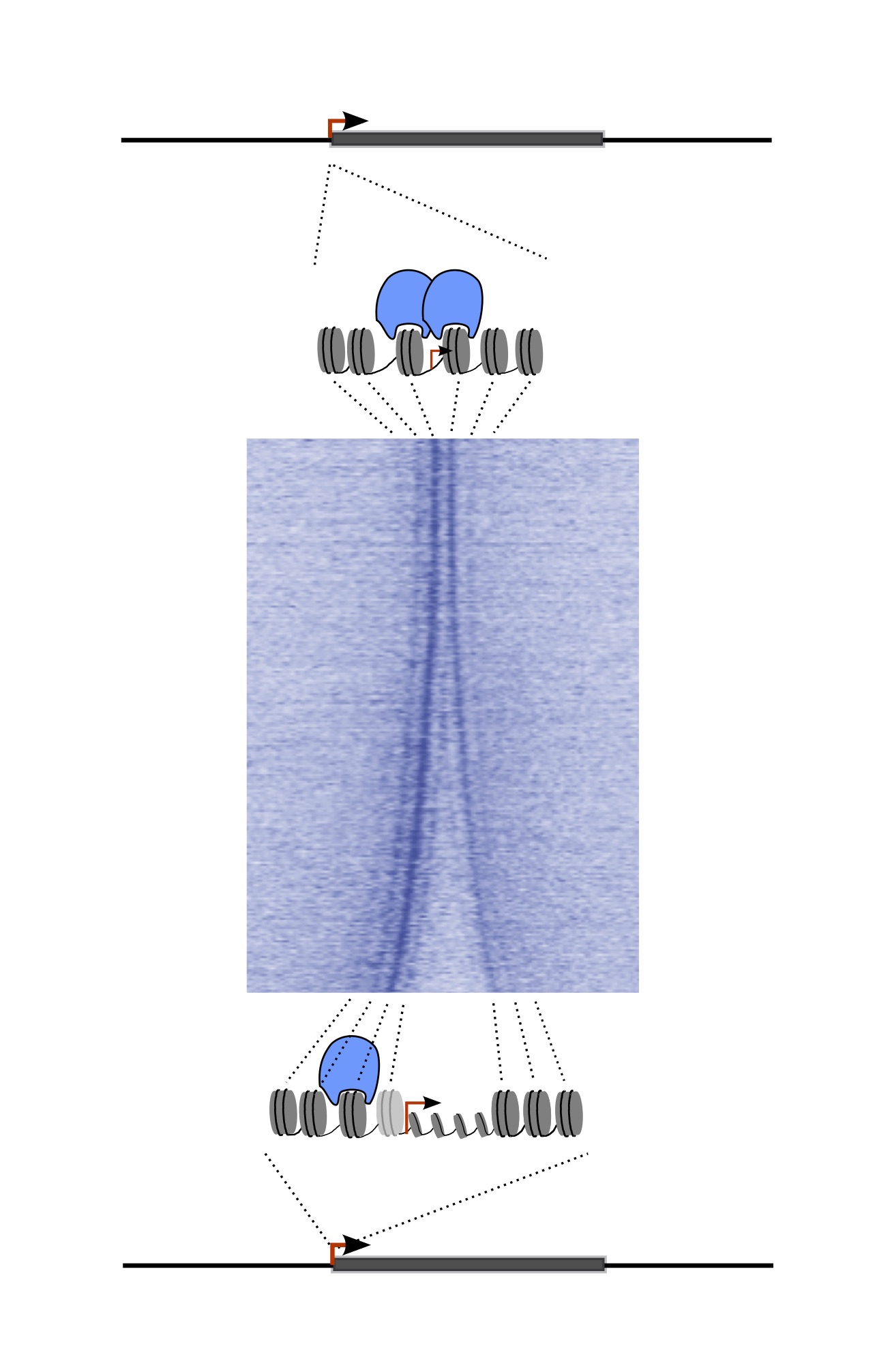Une famille d'enzymes, appelées remodeleurs de chromatine, a pour fonction de faciliter l'accès au génome des enzymes reconnaissant l'ADN. Leur fonction dans l'ouverture de la chromatine, pour rendre accessible l'ADN, était déjà connue, mais leur mode opératoire était mal défini. Dans cette étude, les auteurs démontrent que les remodeleurs se lient sur des nucléosomes bien précis, situés de part et d'autre du site d'initiation de la transcription de chaque gène (cf figure). Les remodeleurs agissent en imposant une dynamique constante au niveau des nucléosomes sur lesquels ils sont liés, ce qui facilite le recrutement des enzymes responsables de la transcription.