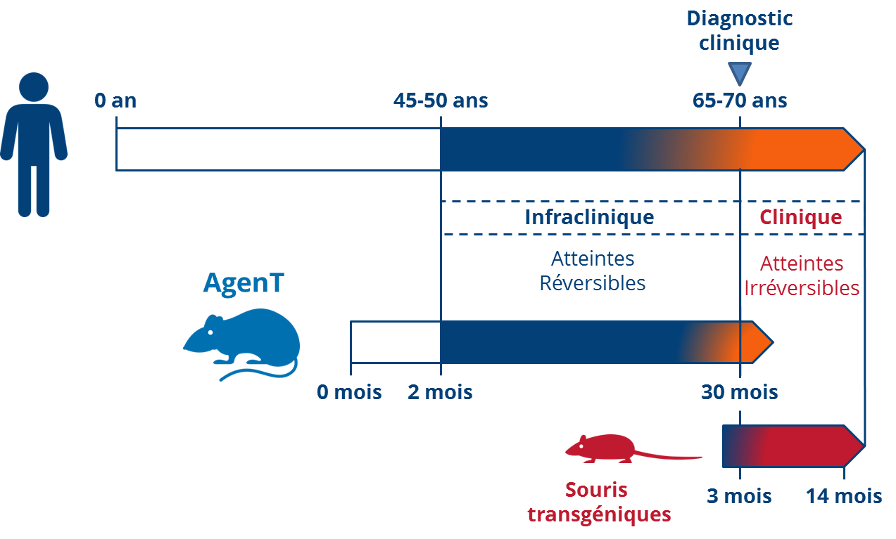 Comparaison entre la progression de la maladie d'Alzheimer 1/ chez les patients 2/ dans les modèles AgenT (la progression des troubles cognitifs et de la formation des plaques séniles est très similaire) 3/ avec les modèles animaux transgéniques disponibles jusqu'à présent.