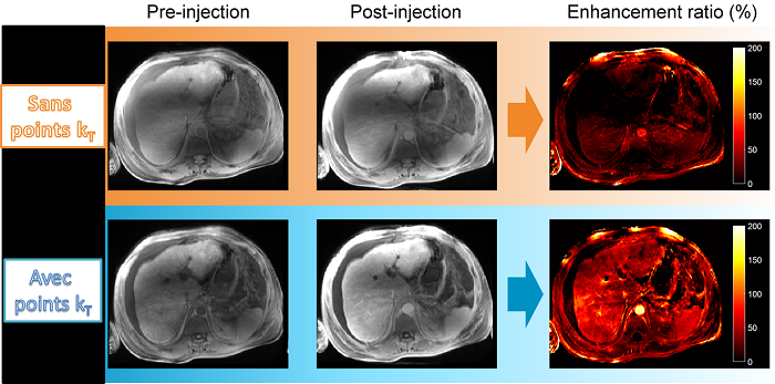 L'étude rapportée ici porte sur 50 sujets avec diverses pathologies du foie imagé à 3T. L'artefact de B1 est manifeste sur certains sujets, même avec une transmission duale (avec 2 sources RF) spécifique à chaque sujet mise en place par le constructeur. Le résultat est que le rapport des images après/avant injection de l'agent de contraste ne donne pas le réhaussement de signal escompté (cf. Figure 1, en haut à droite). En revanche, la méthode de transmission par points kT conduit à la cartographie attendue de ce réhaussement (en bas à droite), en s'appuyant également sur la transmission parallèle duale. Dans une évaluation à l'aveugle, les radiologues jugent la qualité des images bonne ou très bonne dans 85 % des 20 cas cliniques rencontrés avec la méthode des points kT, contre seulement 55 % avec la méthode de transmission parallèle classique du constructeur.