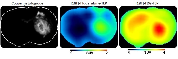 Figure : Comparaison de l'imagerie TEP du lymphome cérébral avec la [18F]Fludarabine ou le [18F]FDG. De gauche à droite, coupe histologique d'un lymphome cérébral et plans correspondants en imagerie TEP utilisant la [18F]Fludarabine ou le [18F]FDG. © LDM-TEP, CEA