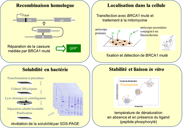 Figure 1 : Schéma de la stratégie expérimentale mise en place pour caractériser les 78 variants de BRCA1 étudiés. Ces expériences ont permis d'évaluer la localisation cellulaire et la capacité à contribuer à la réparation par recombinaison homologue des dommages de l'ADN de chaque variant de la protéine BRCA1 (figures du haut). Elles ont permis de mesurer la solubilité en bactérie, la stabilité et la capacité à lier des peptides phosphorylés cibles des domaines BRCT de chacun de ces variants BRCA1 (figures du bas).