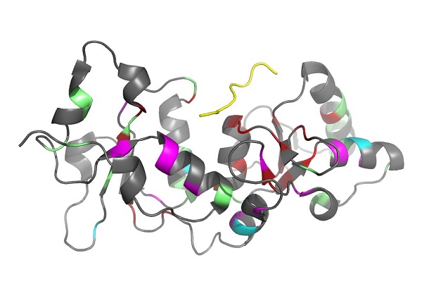 Figure 2 : Structure tridimensionnelle des domaines BRCT de la protéine BRCA1 (en gris) en complexe avec un peptide d'un partenaire (en jaune). Les acides aminés mutés dans les 78 variants analysés sont colorés sur la structure de BRCA1 : 13 variants contrôle étudiés, déjà classés comme causaux (rouge) ou neutres (cyan) à partir de données épidémiologiques ; variants de signification inconnue classés comme potentiellement causaux à partir des expériences de cette étude en rouge également ; variants évalués dans cette étude comme potentiellement neutres en vert ; variants non classés en magenta. Il apparaît clairement qu'un grand nombre de variants mutés dans la région proche du peptide sont causaux (rouges), ce qui suggère fortement l'importance d'un défaut de liaison au peptide dans le processus de cancérogenèse.