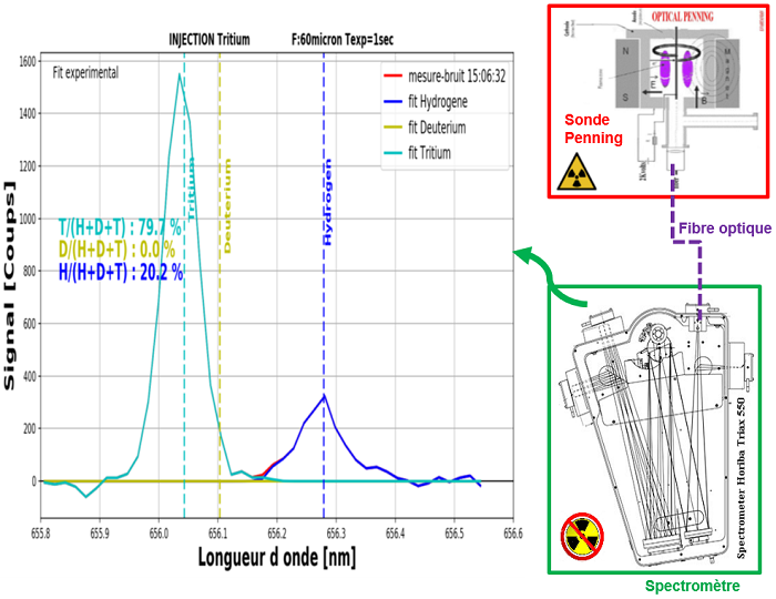 Le principe de la mesure du rapport isotopique tritium/hydrogène repose sur l'introduction du gaz à analyser à faible pression dans une sonde de mesure de pression de type Penning. Un plasma est alors généré dans la sonde et une émission de lumière est observée. Le signal lumineux est transmis par fibre optique à un spectromètre visible pour l'analyse spectroscopique. Chaque isotope de l'hydrogène (hydrogène, deutérium et tritium) possède une signature spectroscopique précise dans le visible : 6560,44 Å pour le tritium, 6561,03 Å pour le deutérium et 6562,79 Å pour l'hydrogène. Ces raies spectrales sont appelés raies de Balmer Ta, Da, Ha. La détermination du rapport isotopique (RI) est alors rendue possible en effectuant le rapport des raies d'intérêt (Ta/Ha pour le RI tritium/hydrogène), l'intensité des raies spectrales étant proportionnelle aux pressions partielles des gaz respectifs (Figure 3).