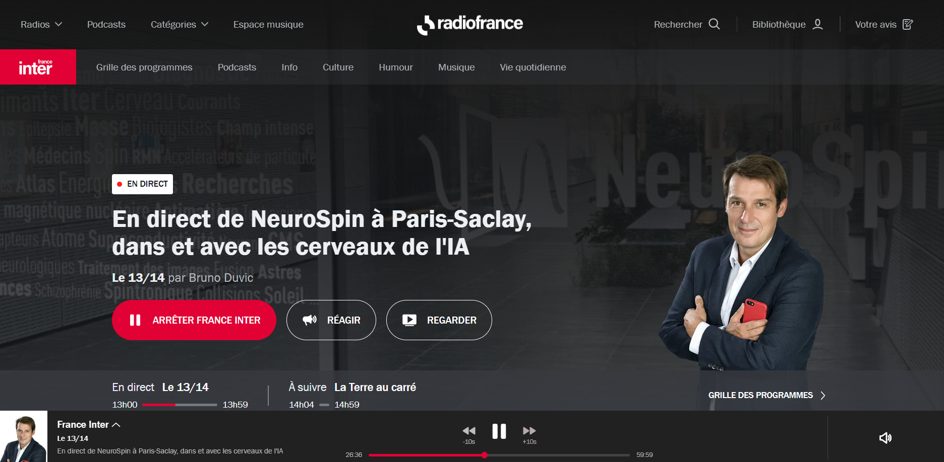 Un reportage avec Édouard Duchesnay de l'équipe SIGNATURE (laboratoire GAIA de l'UMR BAOBAB/NeuroSpin) et Fabrice Poupon, chef de l'installation, sera diffusé en début de journal. Il abordera la façon dont l’IA sera utilisée pour détecter/discriminer certaines maladies cérébrales, notamment mentales.