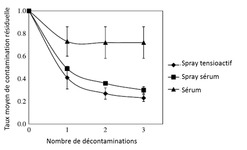 Les formes sprays sont plus efficaces que la solution à verser quel que soit le type de blessure (cf figure ci-dessous). La différence entre les 2 formes spray n’est pas statistiquement significative, même si la solution contenant un agent tensioactif permet d’atteindre un niveau moyen de contamination résiduelle plus faible. La pression, ici égale à 59 kPa pour les 2 formes spray, semble être un paramètre déterminant pour la décontamination de la peau.