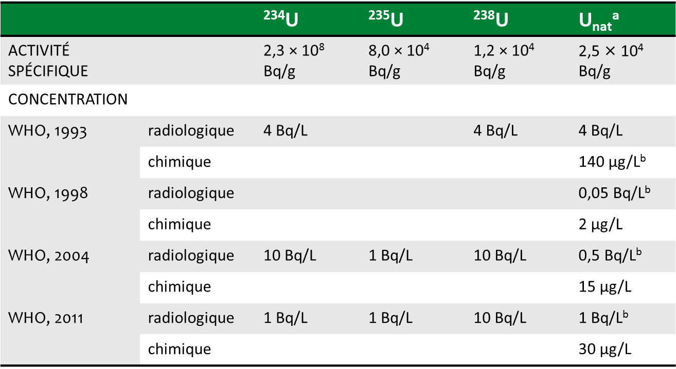 Les auteurs ouvrent une discussion sur l’évolution des valeurs "guides" de l’uranium dans les eaux de boisson en regard des risques chimiques et radiologiques de cet élément. Le tableau ci-dessous montre l’augmentation de ces valeurs fixées par l’OMS (Organisation Mondiale de la Santé) en termes de toxicité chimique entre 1998 et 2011, tandis que, dans la même période, les niveaux en termes de radiotoxicité diminuent. Les auteurs commentent les bases scientifiques étayant ces modifications et soulignent que des travaux dans les domaines de la toxicologie et de la spéciation pourraient permettre de détecter les effets biologiques réels liés à l’exposition à l’uranium via l’alimentation et de proposer pour le futur de nouvelles valeurs "guides".