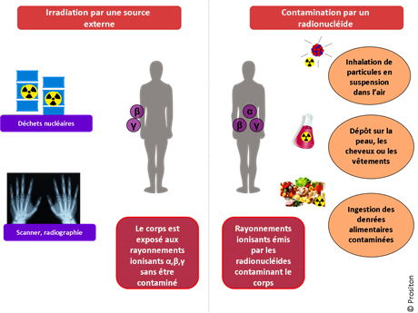 Ainsi, il est fondamental de différencier une contamination (externe ou interne) d’une irradiation afin de pouvoir mettre en place des mesures de protection spécifiques et d’administrer un traitement adapté aux victimes irradiées et/ou radiocontaminées.