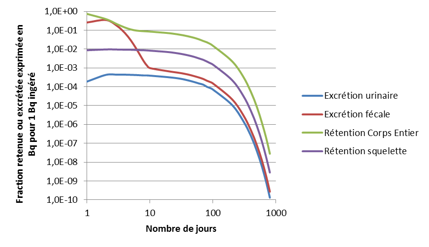 Deux mécanismes entrent alors en jeu pour éliminer le radionucléide de l’organisme : la décroissance radioactive, fonction de la période physique de chaque isotope et l’excrétion biologique, fonction de la toxicocinétique du composé chimique.