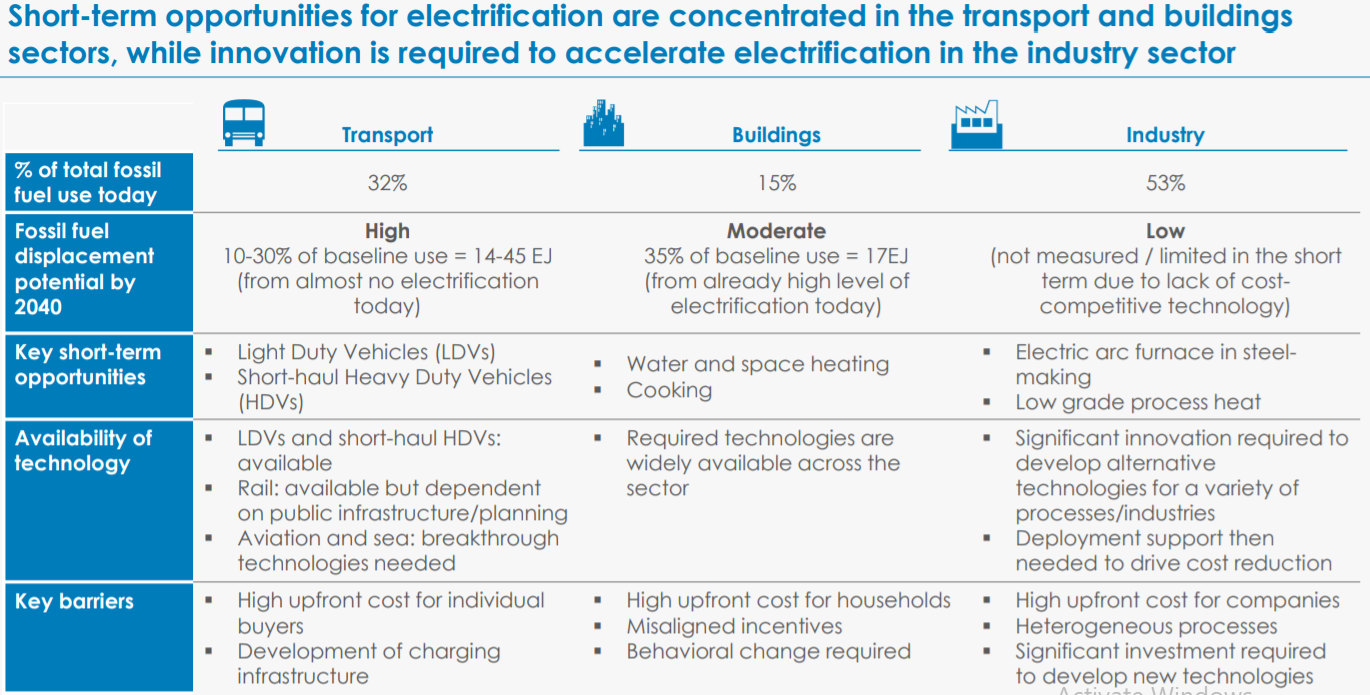 Decarbonization of power combined with electrification is identified as a major transition strategy towards low-carbon energy systems . Extended electrification of end-uses is therefore expected to play an important role in substituting fossil fuels and reducing CO2 emissions . This idea has allured policy makers as one of the most compelling for GHG mitigation. Many studies assess electrification potentials at the sectoral level . Most of them agree that transport is the end-use sector with the highest potential, followed by buildings; on the other hand, industry seems more difficult to electrify. Fewer studies evaluate electrification prospects across all end-uses , and even fewer at the global level. Scarce evidence indicates potential savings of CO2 emissions of up to 2-4 GtCOCO2 in the next 20-30 years.