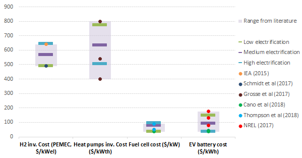 Costs of electric end-use technologies Energy prices will affect the running costs of energy equipment; and relatively cheaper carbon-free electricity is crucial to deliver a higher electrification shares, but not the only one. A key driver to unlock the potential of electricity in end-uses is lies on electric end-use costs and their relative competitiveness with non-electric ones. Assumptions were made on the costs of heat pumps, batteries for electric vehicles and hydrogen fuel cells, which are uncertain and may deeply affect consumers' choices. In an energy system becoming more efficient, the cost structure of energy expenditures is likely to give more weight to fixed costs as opposed to variable costs (European Commission, 2018). Moreover, some electricity technologies have an important potential in terms of efficiency compared to conventional ones (e.g. heat pumps, electric vehicles). This sensitivity analyses section shall provide some conclusions on the underlying cost/efficiency trade-off.