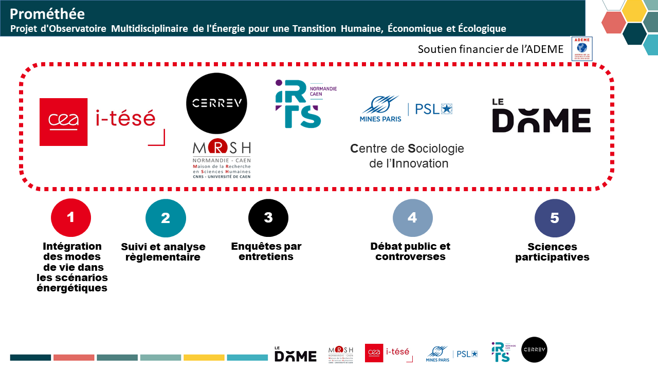 Fin 2022, le CEA I-Tésé, le laboratoire CERREV de l'Université de Caen/Normandie/MRSH, le CSI de Mines Paris, le Dôme de Caen et l'IRTS Normandie-Caen ont lancé Prométhée, un observatoire multidisciplinaire des pratiques d'adaptation aux crises énergétiques et de la sobriété énergétique. L'Observatoire a bénéficié d'un soutien financier du CEA et de l'Ademe.