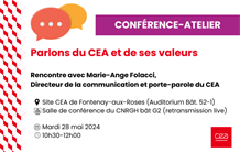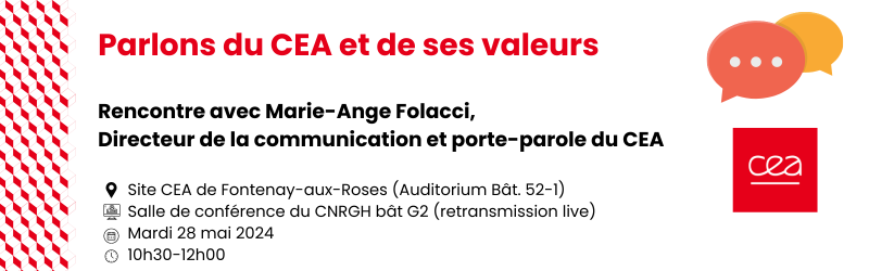 La Direction de centre vous invite à rencontrer Marie-Ange Folacci, directeur de la communication et porte-parole du CEA, pour un atelier de décryptage et d'échanges sur le positionnement et les familles de valeurs du CEA, mais aussi sur la manière de les faire vivre et de les incarner dans votre pratique quotidienne.