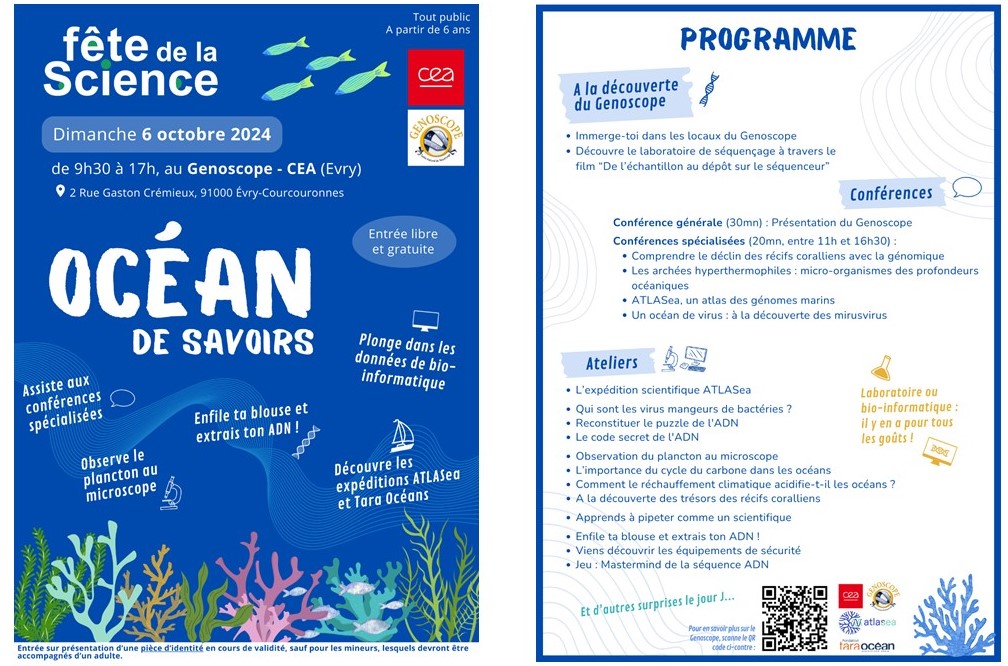 Le dimanche 6 octobre, le Genoscope, centre national dédié au séquençage, fera ses portes ouvertes et proposera un événement riche en activités. Le site CEA d'Évry, situé au 2 rue Gaston Crémieux, sera ouvert à tous, dès l'âge de six ans, avec un accès gratuit et libre. Le moment idéal pour se renseigner sur des sujets variés tel que l'Expédition ATLAsea, le code secret de l'ADN, le cycle du carbone et bien d'autres encore.