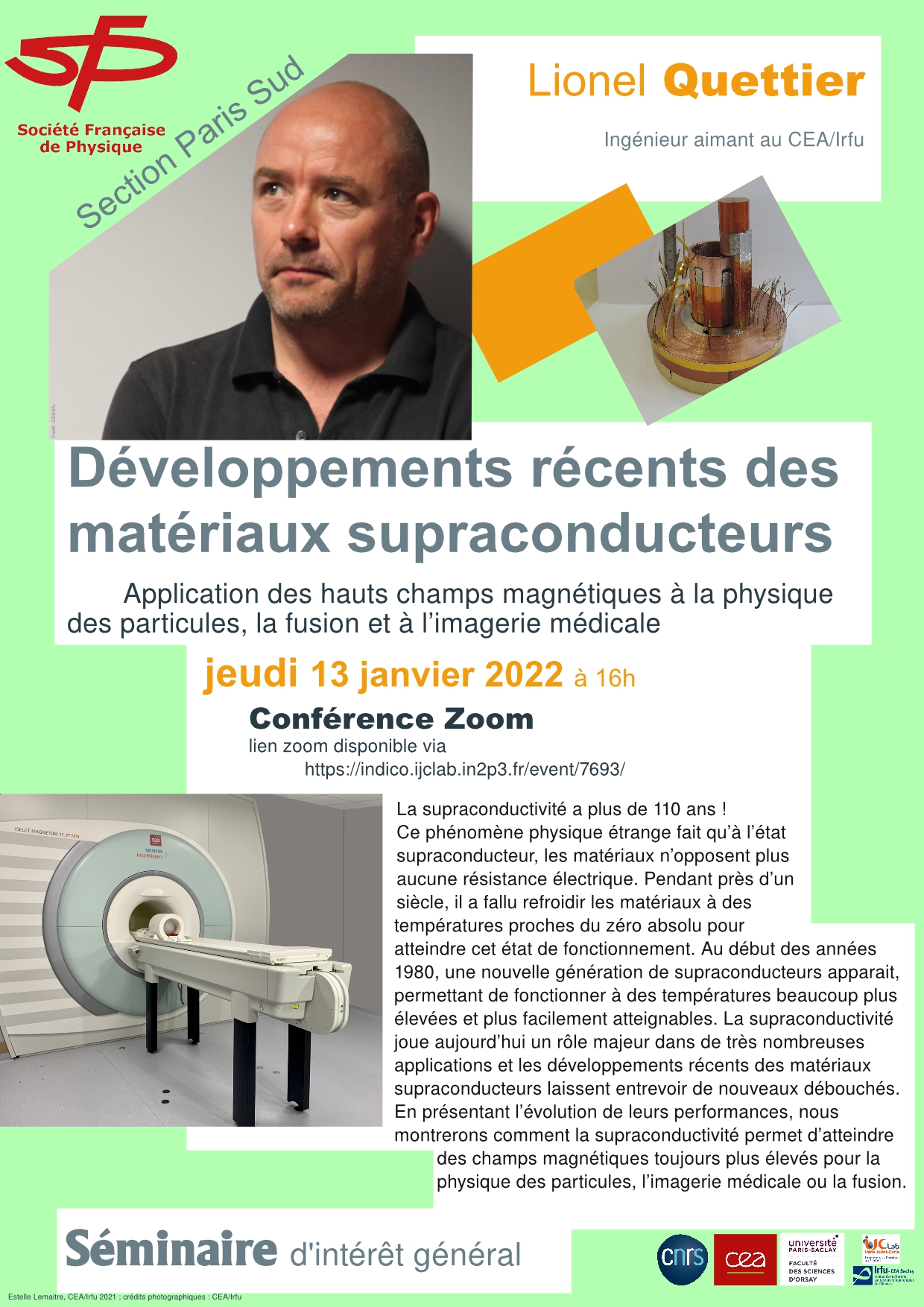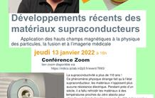La section Paris-Sud de la SFP organise le jeudi 13 janvier 2022 à 16h une conférence sur les développements récents des matériaux supraconducteurs : application des hauts champs magnétiques à la physique des particules, la fusion et à l'imagerie médicale.